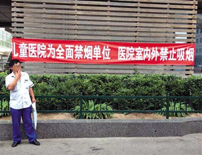 昨日下午,儿童医院院内,一名男子在禁烟条幅前吸烟。