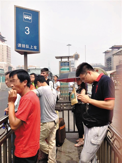 昨日14时许,北京西站北广场,两名男子在3路公交车候车处吸烟。