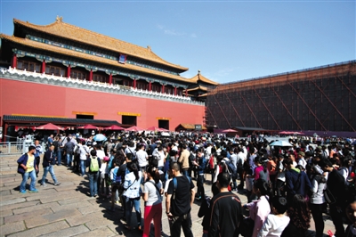 2014年10月2日,故宫午门广场,大批游客前来排队等待检票。当日,有14.4万余人参观故宫。新京报记者 侯少卿 摄