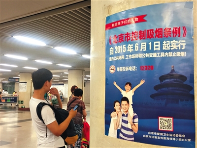 从2015年6月1日起,在北京地区各客运车站的室内所有区域禁止吸烟,包括车站售票厅、候车区、地下通道、卫生间等。记者昨日在北京站、北京南站、北京西站、北京北站等地探访时发现,车站均在显著位置张贴了控烟宣传标语、标识,电子显示屏滚动播放控烟宣传片,并利用广播系统滚动播放控烟提示语。