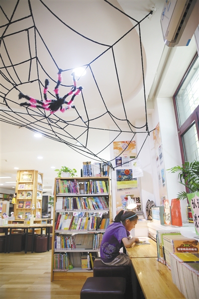 清华附小图书馆内,一名学生在阅读。这里的图书馆结合孩子们的趣味和喜好布置,进去之后仿佛置身童话书屋。