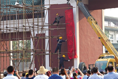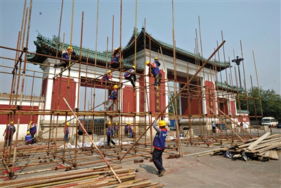 昨日,首钢厂东门,工作人员搭起脚手架,准备开拆。