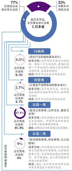 截至2014年底,北京已有77%的事业单位完成了分类。其中行政类占比最少,为0.5%;此外,公益一类占比87.8%,公益二类占比9%,经营类占比2.7%。