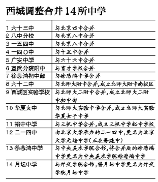 根据西城区本轮教育综合改革方案,除了增加两对按比例对口直升校外,还将对7个中学学区进行调整,扩容至11个,并通过优质校“跨”区合并普通校,扩大优质教育资源覆盖面。