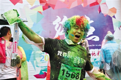 当天最高气温仅13℃,参与选手中有热爱运动的上班族,牵着孩子的潮爸潮妈及全家老少一齐出动的家庭彩跑队。“我们全家都来这里,虽然下了雨,但全家都很开心。”一位彩跑爱好者说。
