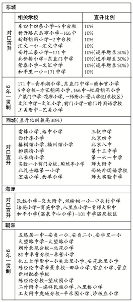 照此计算,今年东城、西城、朝阳、海淀四个城区增加的对口直升校,将达到43对。