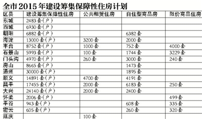 新京报讯 (记者马力)记者昨日从市住建委了解到,今年各区县建设筹集保障房的计划均已确定,各区县建设筹集保障房总和达近15万套,自住房超过3万套。其中通州区的计划量最高,将建设筹集保障房3万套。