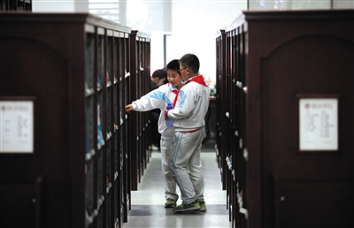 前日,人大附小的学生们参观图书馆。在北京市昨日发布的意见中,提出推动图书馆等向中小学生免费开放。新京报记者 薛珺 摄