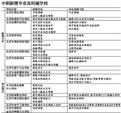 今年北京的中职招生最大变化是专业增加。记者从北京市教委了解到,今年全市15所中职校共新增29个专业,包括老年人服务与管理、新媒体信息采编与传播、物联网技术应用、航空服务和医药卫生财会等,学制从三年到四年不等,具体招生人数和范围,考生可参考今年4月底下发的《中招简章》。