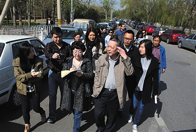 昨日,市人大代表查看左安门西滨河路两侧停车情况。新京报记者 王贵彬 摄