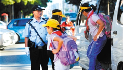 2012年9月3日,海淀区实验小学门口,高宝来正帮助来上学的小学生下车。 资料图片/新京报记者 尹亚飞 摄