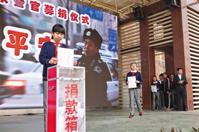 昨日,海淀实验小学,学生代表上台把装有班级捐款的信封放入捐款箱。当日,学生们为民警高宝来捐款。 新京报记者 王嘉宁 摄