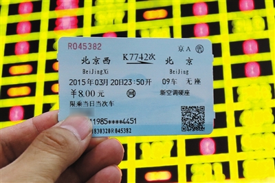 昨日,一名乘客展示刚刚购买的北京西站至北京站的K7742次列车车票。 新华社发