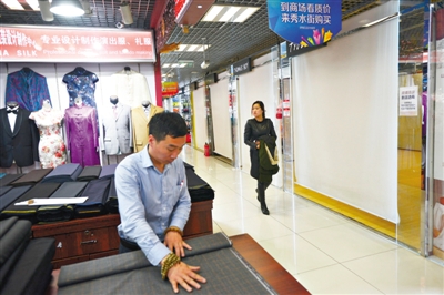 昨日,在秀水街市场,三层服装区已有数十家店铺关门。三层西侧的两条通道周边,就有十个商铺关门,玻璃门被白色门帘遮挡着,门旁贴有“原铺清退,新店选商”的标示,并附有两个“选商”电话号。据了解,这些商铺以前多是卖女士服装和配饰的。三层西侧拐角处,一个店铺被厚厚的彩色塑料膜“包裹”着,上写“正在装修中,敬请期待”。旁边的一家布匹店主介绍,这家商铺前几天刚搬走,新店装修完就开始营业。