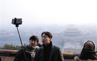 1月13日,景山峰顶,游客在雾霾中用自拍神器留影。图/CFP