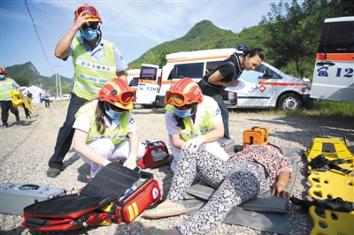 去年7月14日,京津冀重大泥石流突发事件医疗卫生救援联合应急演练。新京报记者 李飞 摄