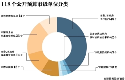 统计显示,公开预算的118个市级单位包括48个市委、市政府工作部门,以及议事协调机构和临时机构的办事机构、市政府派出机构、市检察院和市高院、市群众团体、市委市政府直属事业单位、其他机构和单位等。