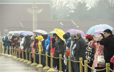 昨日,游客在北京天安门广场撑伞等待观看降旗仪式。当日下午北京普降小雪。新华社发