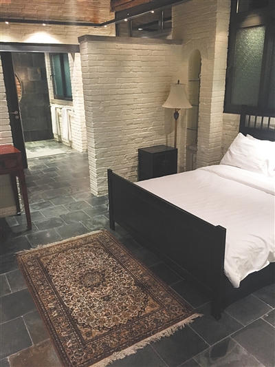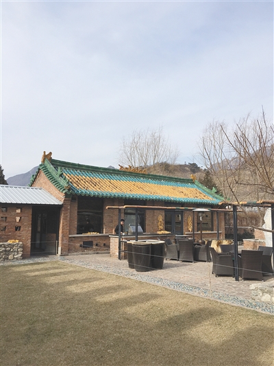 这个酒店的老板是一位美国人。瓦厂酒店的前身,是村子里的一个琉璃瓦厂,后来租给了这位美国人,他就利用这些剩下的残破瓦片,“变废为宝”了。如今的瓦厂酒店中,瓦片是重要的特色元素。红色、黄色、绿色的琉璃瓦打碎以后,铺在花园的小径上,金光闪闪的,格外好看。