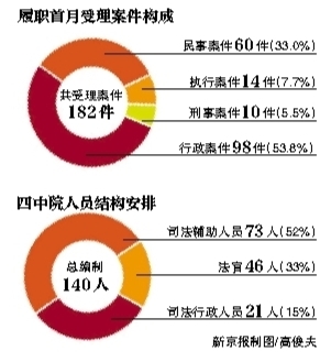 作为新一轮司法体制改革的一部分,2014年12月30日,北京首个跨行政区划法院——北京市第四中级人民法院正式挂牌成立。截至1月30日,四中院履职首月共受理各类案件182件。其中,行政案件98件,占53.8%。