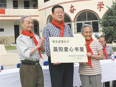 陈荣超“老牛自知夕阳短,不待扬鞭自奋蹄”这行诗句,可谓是对“首都十大公德人物”陈荣超(左一)老人的生动写照。陈荣超退休后20年如一日捐资助学,发挥余热。他一日三餐粗茶淡饭,却用毕生的积蓄60余万元,建起两所希望小学、3个希望图书馆,资助6名贫困学生。