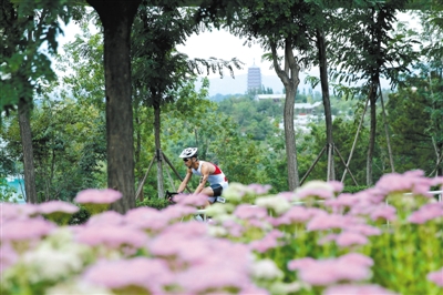 园博绿道园博绿道是北京市绿道建设体系的示范工程,绿道总长度64.5公里,总面积143.67公顷,串起北京园博园、北宫国家森林公园、青龙湖公园等。沿线建成城市骑行区、山地体验区等七大景观区域,成为集生态、休闲、景观为一体的城市绿色慢行休闲系统。这是一条名副其实的绿道,绝大部分道路都掩映在树林、绿植和各种鲜花中间。这条具有30多米海拔差的绿道建设在环山丘陵地形中,非常适合骑行。这还是一条景观大道,骑行者沿途能欣赏到园博园、北宫彩叶、大枣园等景区美景。赵智和 摄