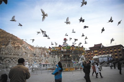 虽然不是周末,来这里观赏冰灯的游客也络绎不绝。来自通州的陈先生刚刚带着家人在附近的石京龙滑雪场玩了一上午,“孩子也放假了,我们几家朋友一起就带着孩子出来玩一玩”,陈先生说,北京有冰灯的地方不少,但是要说规模最大、冰灯最好看,自己还是最喜欢龙庆峡。