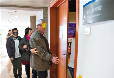 在触摸体验阶段,志愿者两两一组,模拟健全人带盲人的场景,要求健全人引导“盲人”触摸、感知体验馆内的物品。