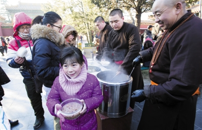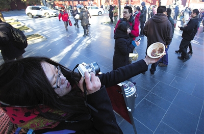 昨日“腊八”,市民到雍和宫争喝“福粥”。昨日雍和宫向游客舍粥98锅,共有4500人喝粥祈福。本版摄影/新京报记者 高玮