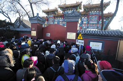 昨早7时许,雍和宫开门前已有大批市民排队等候。