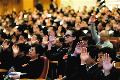 昨日,市政协十二届三次会议闭幕会上,委员举手表决。新京报记者 薛珺 摄