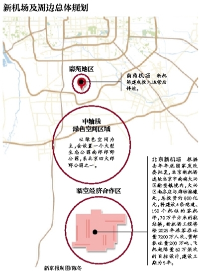 将来,新机场及周边区域,将主要有三大区域,一是新机场及临空经济区。二是南苑地区,这两个地区也将作为南城新的经济增长点。此外还有中轴线上的绿色空间区域。