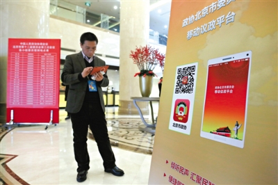 昨日,北京五洲大酒店委员驻地,大厅里竖着政协北京市委员会移动议政平台的二维码。 新京报记者 薛珺 摄
