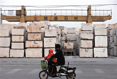 1月13日,十八里店乡西直河村石材市场,一家石材加工厂院里堆放着石材。西直河村石材市场目前正面临清退。新京报记者 薛珺 摄