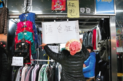 李斌说,近年来,互联网对实体服装店的冲击很大,他的生意没有前些年那么兴旺,天皓成拆迁的消息更让他雪上加霜。昨天,市场关闭前的最后一天,李斌仍在甩货。这几天,他只卖出了一个箱子,原来标价60元,卖出时的价格是20元。“一年了,生意一直很差,甩货都甩不出去。走的走,散的散,我们不知道哪一天就拆,什么新货也不敢进,只能甩老货。老顾客基本都断了,散客知道这里要拆,来的人也越来越少。”