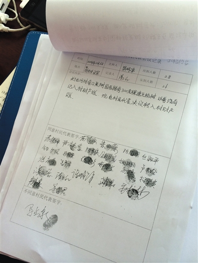 按手印如今,通州永乐店镇西河村大小村务都须通过村民代表会议决议,村民签名之后还须按手印。在上个月西河村召开的一次村民代表会议上,一个关于村内种植果园的决议获得了25位村民代表的支持,但也有村民投出了“反对票”。