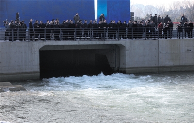 2014年12月27日,南水北调中线一期工程总干渠终点团城湖明渠开闸放水,北京市南水北调工程正式通水。 新京报记者 薛珺 摄
