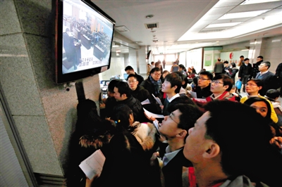 1月5日,北京国土资源局土地拍卖中心,人们通过电视关注拍卖现场情况。 新京报记者 王贵彬 摄