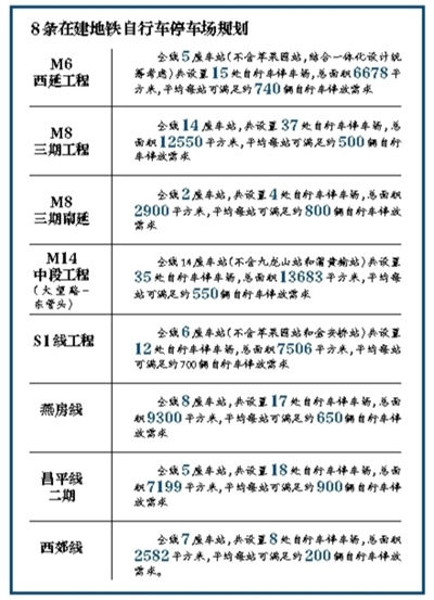 目前,本市正在施工的地铁新线共8条,为6号线西延线、8号线三期、8号线三期南延线、14号线中期、S1线、燕房线、昌平线二期和西郊线。市轨道交通建设管理有限公司相关负责人表示,新规划的约125个自行车停车场分布在这8条线的各站点,做到所有线路各站点全覆盖。