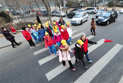 石景山区银河小学门前12米宽的马路是每个孩子上学的必经之路,虽然没有红绿灯,但孩子们都知道过马路前先找手持红旗的“义工奶奶”。2003年,石景山区五芳园社区的退休老人组成义工队,每天轮流送孩子们过马路。11年来,这条车流密集的路上没有一个孩子出过事故。