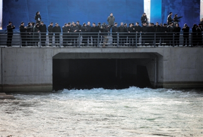 昨日上午,在团城湖明渠,汉江水从闸门奔涌而出,浪花飞溅,将水面上原有的薄冰冲碎,流向不远处的团城湖调节池。由于水流较快,在水面上形成了数个很大的漩涡。