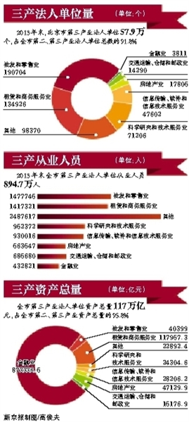 此外,数据显示,北京服务业资产总量持续壮大。2013年,全市第三产业法人单位资产总量117万亿元,占全市第二、第三产业资产总量的95.8%,比二经普增长88.1%。其中,88.7%的资产规模集中在金融业、租赁和商务服务业、房地产业3个行业。