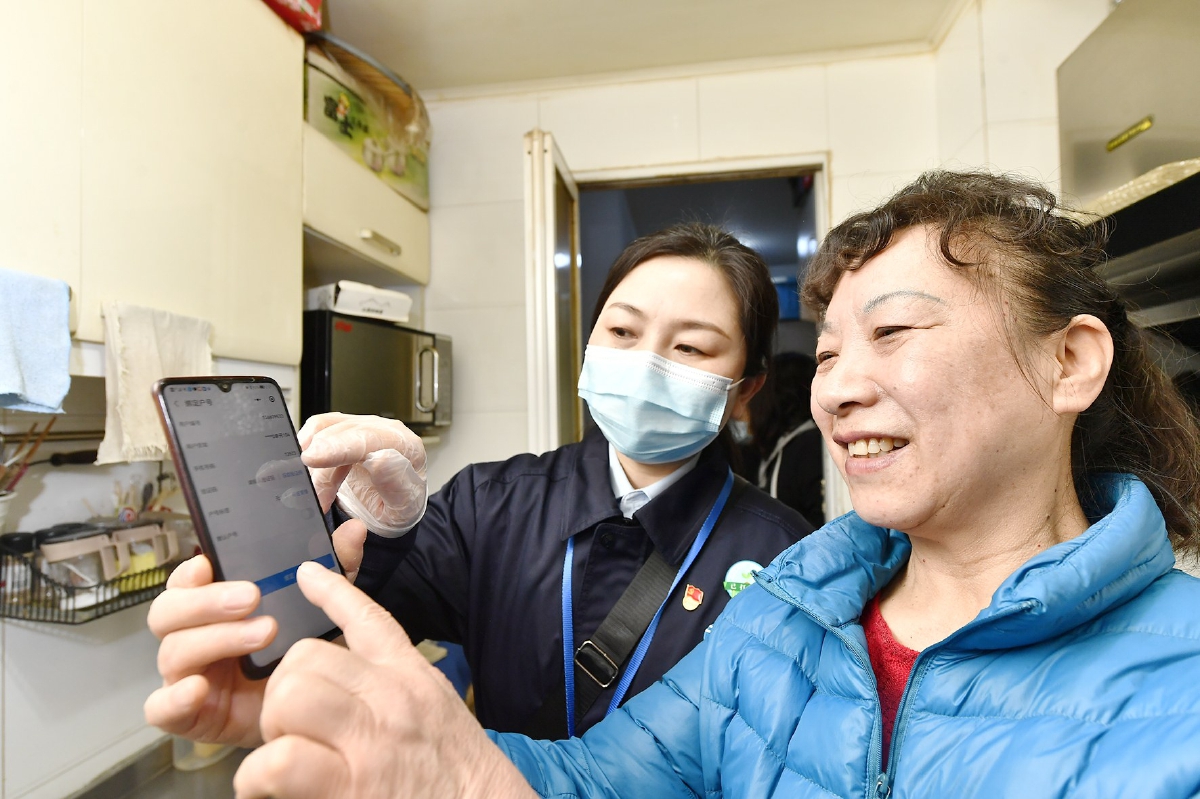 工作人员指导居民通过手机APP服务终端查询相关业务。记者 唐建/摄