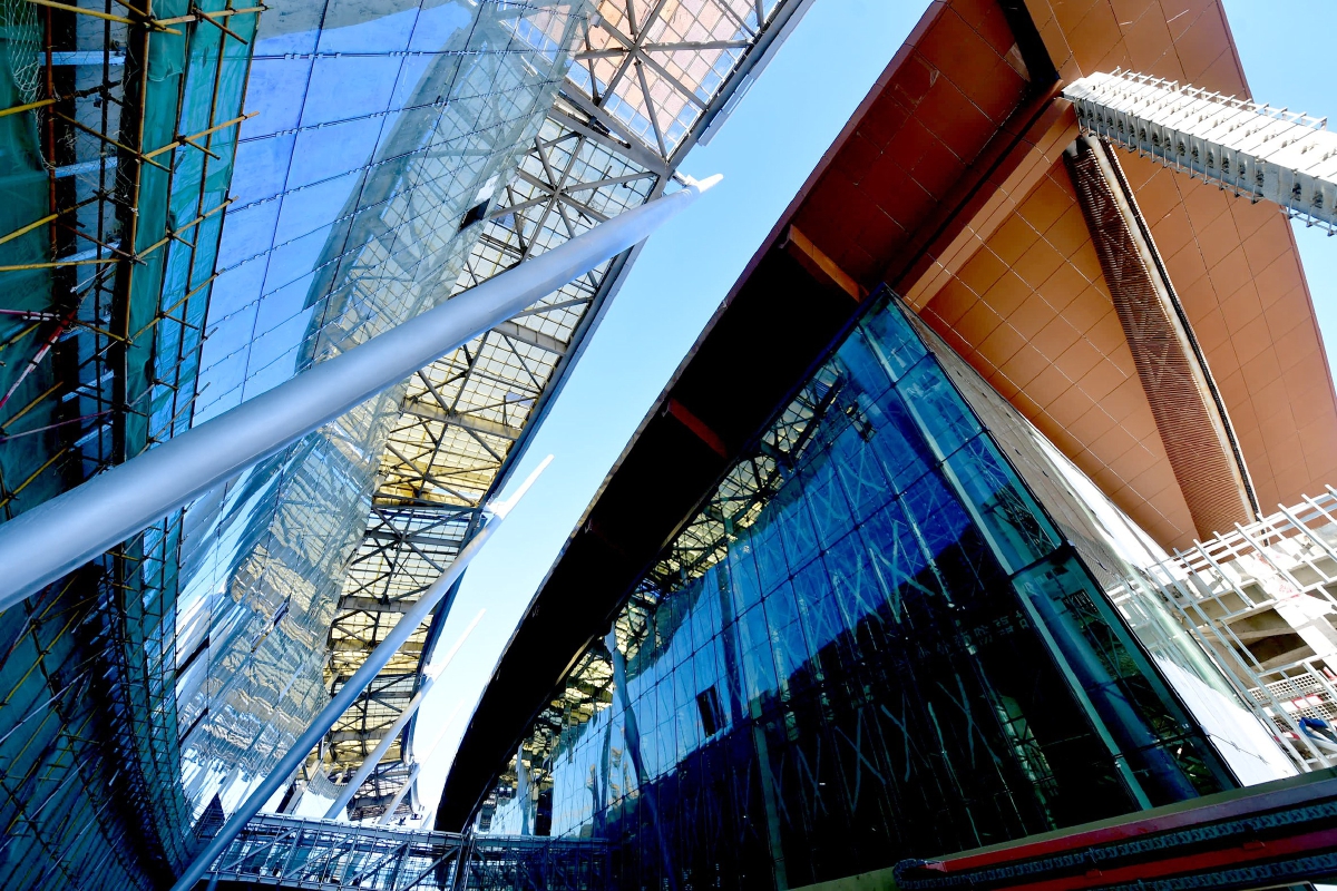 沿着一条古朴的木栈道蜿蜒曲行拾级而上,站在“帆船”造型的大运河博物馆(首博东馆)门前,看着挑起的飞檐与剔透的幕墙,一线工人刘师傅一脸兴奋。“我刚来时这里还是一片荒地,你看,现在观众共享大厅和主楼都已平地起高楼,南侧宛若巨帆高高扬起,北侧形如巨舰劈波斩浪。”刘师傅说。