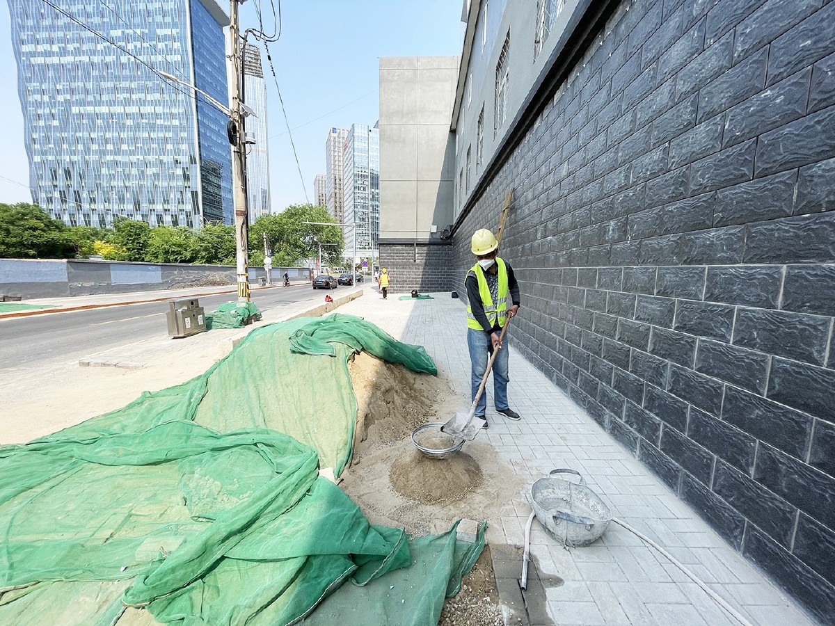 下午2时,通州区永顺南街东口处,十几名工人正给刚修好的围墙贴崭新的瓷砖。现场施工负责人介绍:“这里原来都是商铺,今年3月份永顺镇治理开墙打洞之后,把这些商铺都封了,然后在原有位置贴瓷砖,让街道看起来更美。”