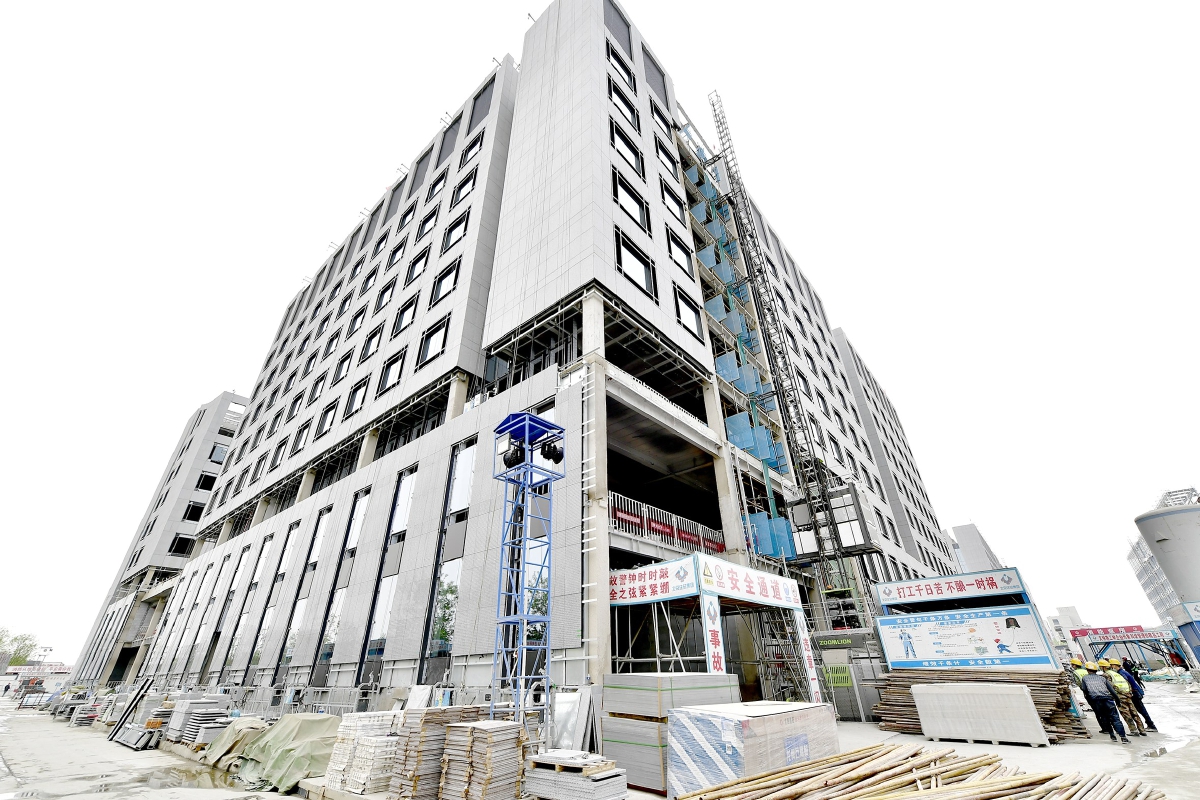 预计6月底,行政办公区二期将可实现幕墙施工收尾。记者 唐建/摄
