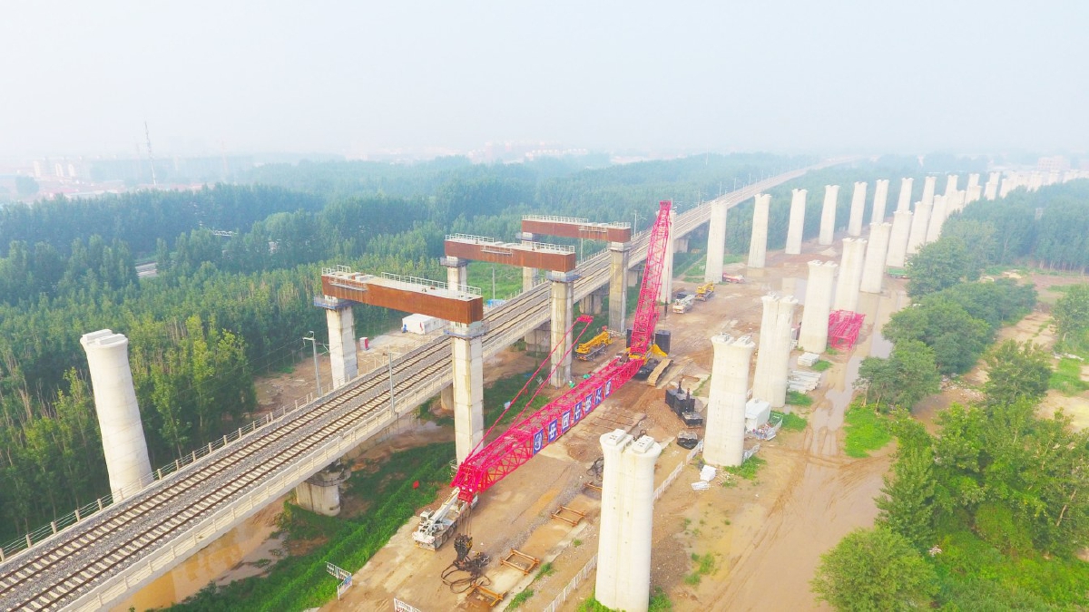 津兴铁路胜芳右线特大桥钢横梁完成吊装