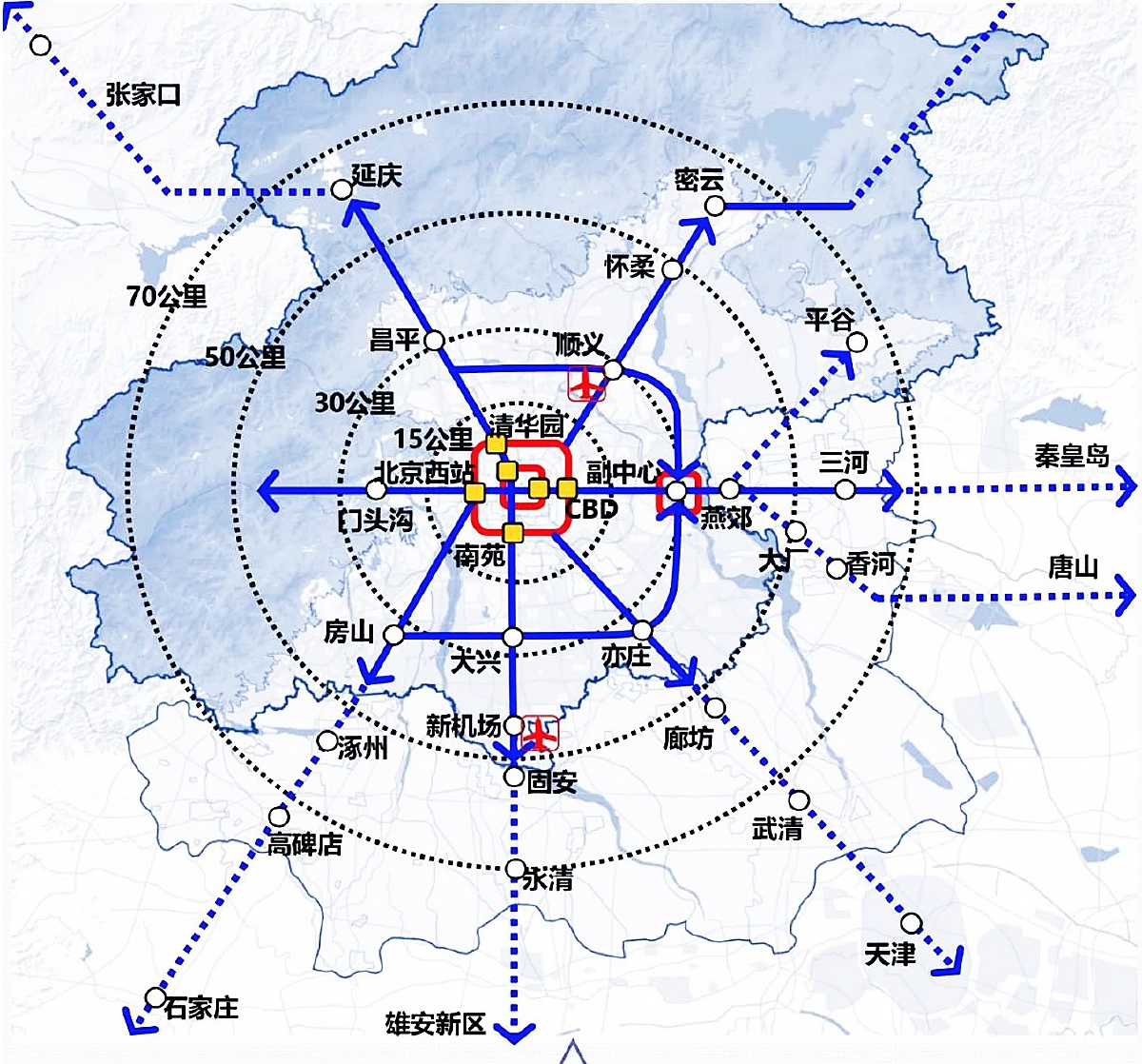 区域级客运枢纽依托城际铁路和区域快线打造,主要布局在中心城区与多点新城地区,用于承担京津冀核心区域和首都圈地区客运功能。中心城区的区域客运枢纽主要功能为加强重点功能区对外辐射力,带动区域协同发展,如北京东站。多点新城的区域客运枢纽主要功能为提升区域发展动能,如昌平站、顺义站、黄村火车站等。