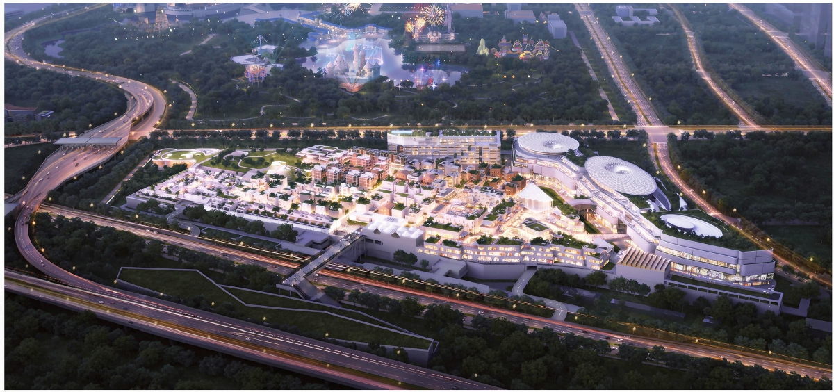 张家湾车辆段综合利用项目位于城市副中心12组团(文化旅游区),是北京轨道交通7号线东延工程的一部分,也是城市副中心首宗地铁上盖一体化开发项目。该项目西侧与环球影城仅一路之隔,东距张家湾老镇约2公里,北距城市绿心约3公里。这一项目的地上地下总开发规模约50万平方米,分为集中商业、高端酒店、文旅小镇三大组团,定位为具备独特客流集聚能力的商业文化娱乐旅游综合体。