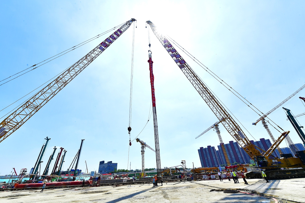 昨天,亚洲最大地下综合交通枢纽01标段站房核心区工地现场,长达48米的抗拔桩钢筋笼顺利下放完成。记者 唐建/摄